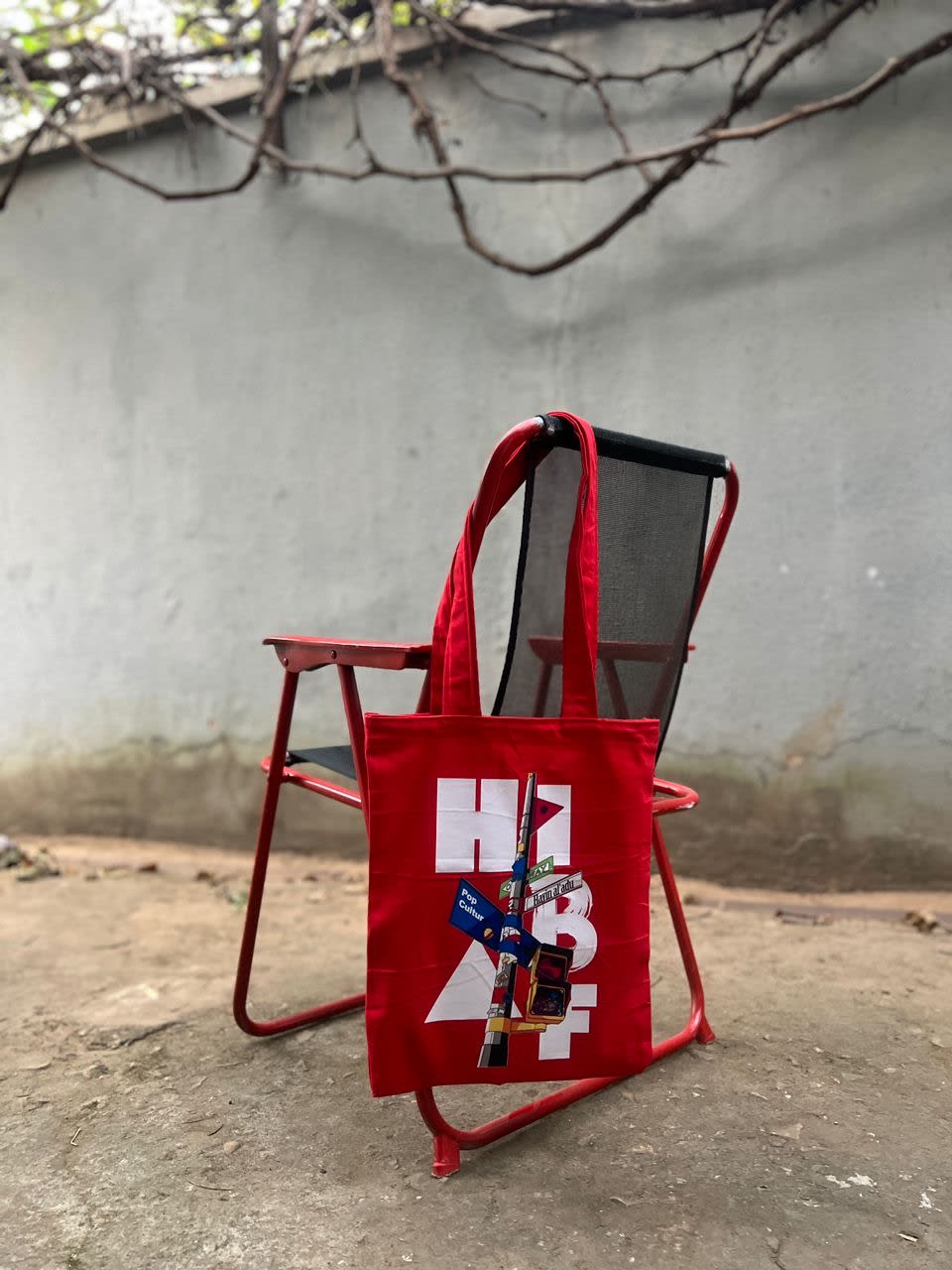A large open tote bag with two handles made with strong fabric of vivid red hues celebrating the Hausa and its diaspora culture across the world.
